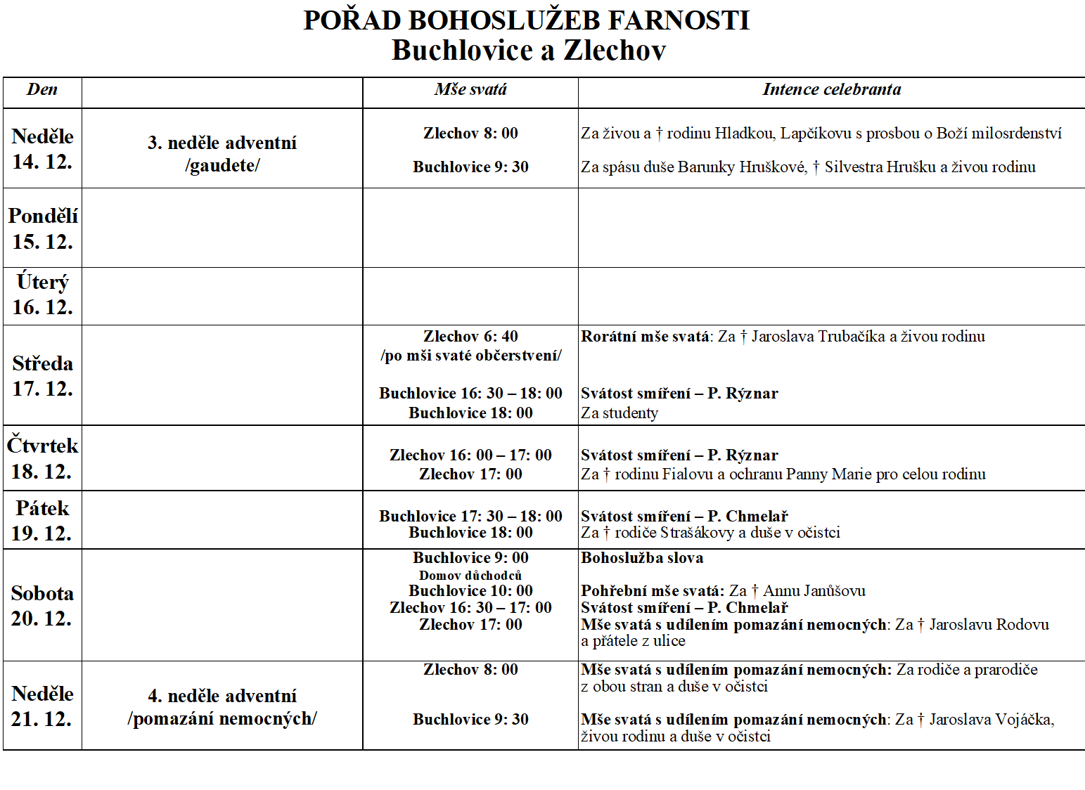 Svátost smíření je možné přijmout vždy 20 minut před mší svatou mimo neděli.